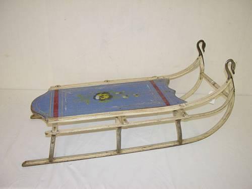 19TH CENT. CHILDS SLED W/ PAINTED DECORATION OF PANSEY FLOWERS & WROUGHT IRON GOOSE NECK & GOOSE HEAD RUNNERS - PAINT WEAR & IMPERFECTIONS;