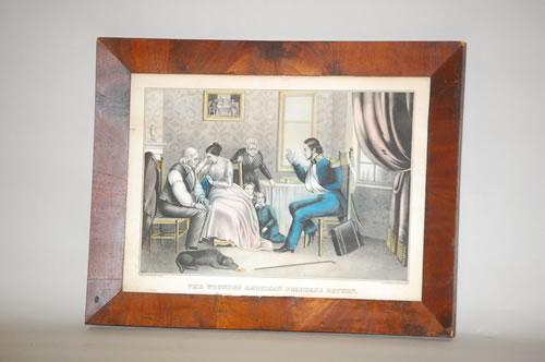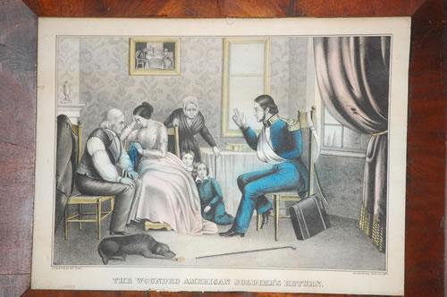 19TH CENT. COLORED CIVIL WAR LITHOGRAPH-"THE WOUNDED AMERICAN SOLDIER'S RETURN" BY J. WARD 52 CORNHILL BOSTON MA IN AN OGEE MAHOGANY FRAME (9 1/2" X 13 1/4" SIGHT SIZE) - SMALL TEARS, TONING, FOXING, STAINS, LOSSES TO FRAME, ETC.