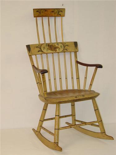 19TH CENT. COMB BACK WINDSOR ROCKING ARM CHAIR IN MUSTARD PAINT W/ GRAIN PAINTED SEAT & PAINTED FRUIT DECORATION - WEAR, REPAIRS, & IMPERFECTIONS