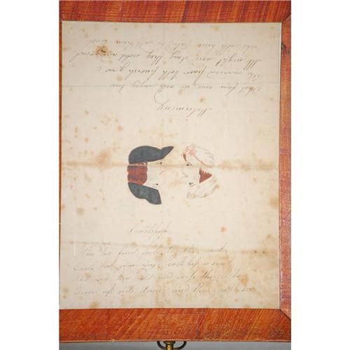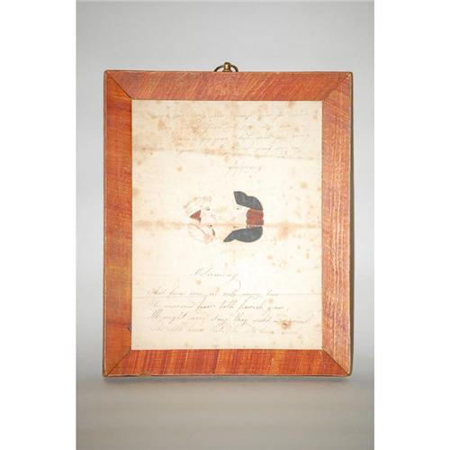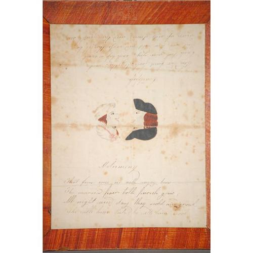 19TH CENT. COMIC WATERCOLOR & CALIGRAPHY REBUS - AMUSING VERSE & WATERCOLOR ILLUSTRATED REBUS ON PAPER REGARDING COURTSHIP & MATRIMONY (CIRCA 1810'S)-FRAMED (8 1/2" X 6 3/4") - WEAR, CREASE SPLITS, TONING, FOXING