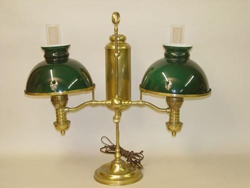 19TH CENT. DOUBLE BRASS STUDENT LAMP W/ GREEN CASED GLASS SHADES & CHIMNEYS-IMPROVED DUPLEX, B.B. & C. CO. BURNERS (ELECTRIFIED)(24 1/2" T X 27" L X 10 1/2" W) - REPAIRS, SPLITS IN BASE, IMPERFECTIONS
