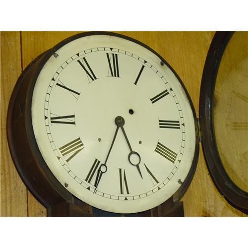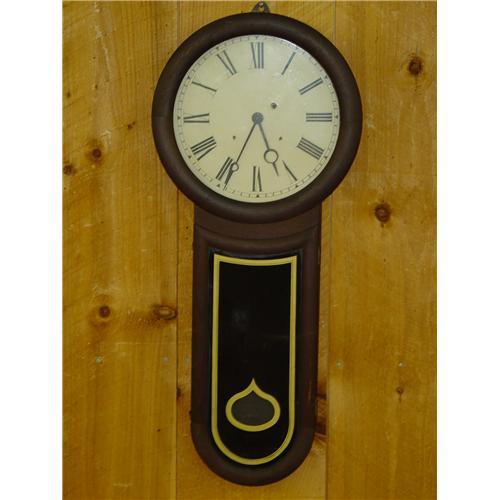 19TH CENT. E. HOWARD TYPE REGULATOR WALL CLOCK-NO. 11 STYLE, BLACK WALNUT CASE W/ ROUND PAINTED METAL FACE & OVAL ENDED DROP W/ GOLD & BLACK REVERSE PAINTED GLASS PANELED DOOR W/ PENDULUM & WEIGHT - WEAR, LOSSES, IMPERFECTIONS;