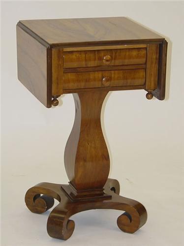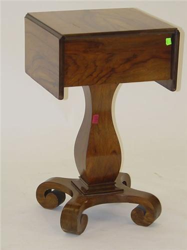 19TH CENT. EMPIRE MAHOGANY 2 DRAWER DROPLEAF STAND W/ SHAPED PEDESTAL BASE & SCROLL FEET (28" T X 16 1/2" W X 16" D) - WEAR & IMPERFECTIONS