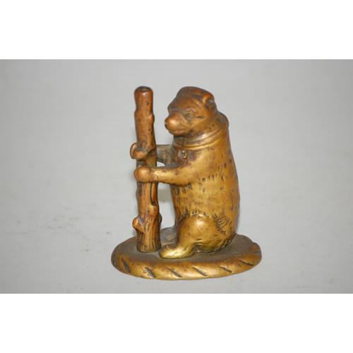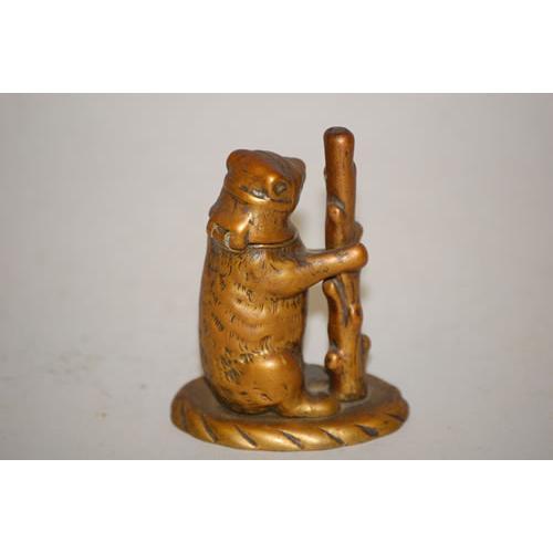 19TH CENT. FIGURAL BEAR TOOTHPICK HOLDER - 3" FIGURAL<BR>BRASS BEAR TOOTHPICK HOLDER W/ HINGED HEAD LID, TREE<BR>& OVAL BASE - MISSING CHAIN & EYES, WEAR, OXIDATION,<BR>IMPERFECTIONS