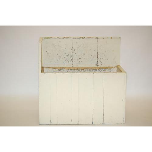 19TH CENT. FIREWOOD STORAGE BOX - PINE BOX W/ TONGUE & GROOVE CONSTRUCTION & HIGH BACK & SIDE BACKSPLASH PANELS IN CREAM COLORED PAINT (38 1/2" T X 40" W X 21" D; BOX ONLY-24 1/2" T) - WEAR, PAINT LOSSES, IMPERFECTIONS