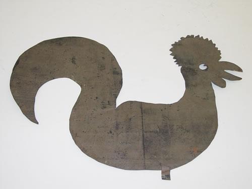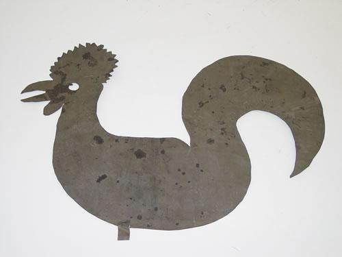 19TH CENT. FOLK ART CUT TIN ROOSTER TEMPLATE FOR STENCIL WORK OR WEATHERVANES W/ TRACES OF BLACK PAINT (13 3/4" T X 18 1/2" W) - WEAR & IMPERFECTIONS;