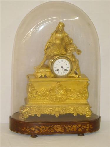 19TH CENT. FRENCH GILT BRASS CONTINENTAL FIGURAL MANTLE CLOCK W/ MAN ON CHAIR W/ BOOKS ON ROSEWOOD OVAL PLINTH W/ INLAY & BLOWN GLASS DOME - WORKS SIGNED & DATED 1855, LOSSES, WEAR & IMPERFECTIONS