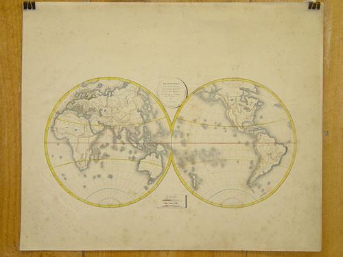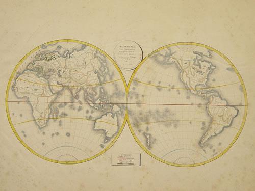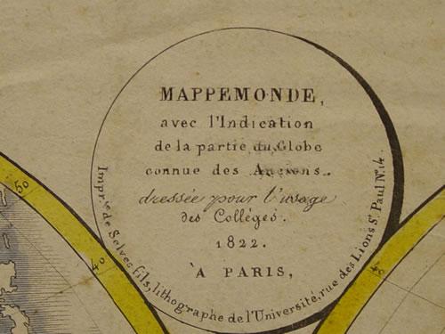 19TH CENT. FRENCH GLOBAL MAP OF THE ANCIENT WORLD "MAPPEMONDE - AVEC L'INDICATION DE LA PARTIE DU GLOBE CONNUE DES ANCIENS ETC."-1822, PARIS; UNFRAMED (16 1/4" X 19 3/4") - FOXING & LIGHT SOILING;