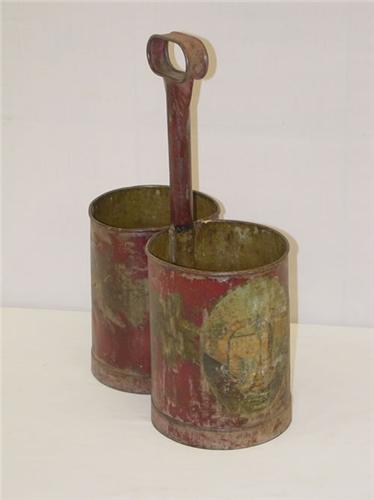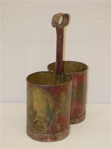 19TH CENT. FRENCH PAINT DECORATED TIN BOTTLE CARRIER- RED BACKGROUND W/ 2 OVAL LANDSCAPES W/ FIGURES & BUILDINGS & GOLD FOLIAGE & GRAPES DECORATION (17" T X 12 1/2" W X 6 1/4" D) - LOSSES & IMPERFECTIONS