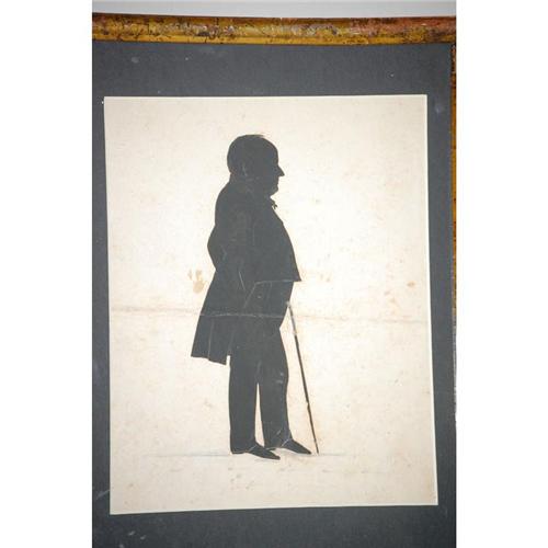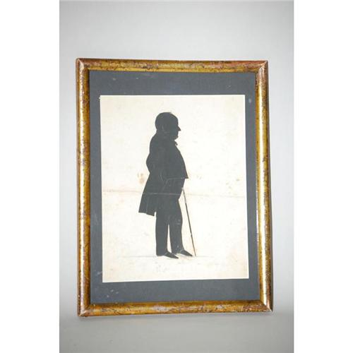 19TH CENT. FULL BODIED STANDING SILHOUETTE - PORTRAIT OF GENTLEMAN W/ CANE IN EDOUART STYLE-MATTED IN A GILT FRAME, IDENTIFIED ON BACK AS GRANDFATHER FREEMAN, SARATOGA NY 1841 (10" X 8") - WEAR & STAINS, CREASES & REPAIRS, IMPERFECTIONS