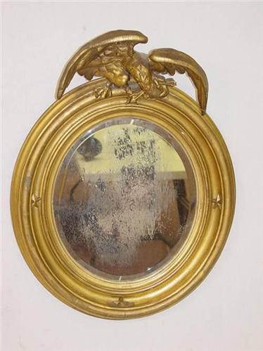 19TH CENT. GILT OVAL BEVELED MIRROR W/ CARVED EAGLE CREST W/ ARROW & STARS (26" T X 19" W) - WEAR & LOSSES;