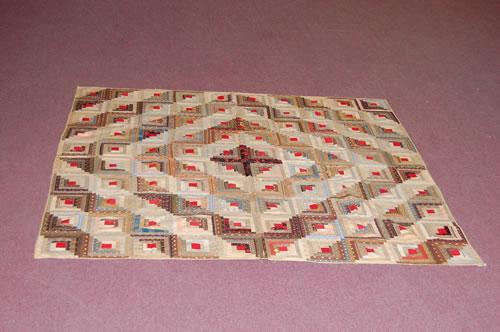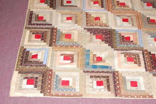 19TH CENT. HAND STITCHED QUILT - 19TH CENT. LOG CABIN PATTERN SUMMER QUILT W/ ALTERNATING BANDS OF PRINT COTTON CALICO, SOLIDS & PATTERNS (76" X 72") - WEAR, LOSSES, STAIN, IMPERFECTIONS