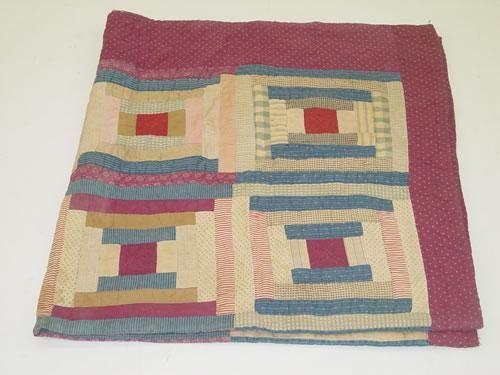 19TH CENT. LOG CABIN QUILT-HAND SEWN COTTON (70" X 76") - WEAR, LOSSES & STAINING