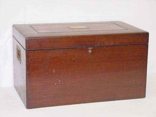 19TH CENT. MAHOGANY TIN LINED HUMIDOR W/ BRASS HANDLES - IMPERFECTIONS & WEAR TO WOOD, LOCK DAMAGE