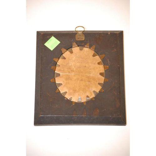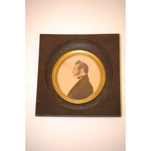 19TH CENT. MINIATURE WATERCOLOR PORTRAIT OF A GENTLEMAN IN BLACK FORMAL DRESS & LONG SIDEBURNS- UNSIGNED IN A WOODEN FRAME W/ BRASS LINER & FADED PROVENANCE ON THE (6 1/4" X 5 1/2") - WEAR, TONING, IMPERFECTIONS