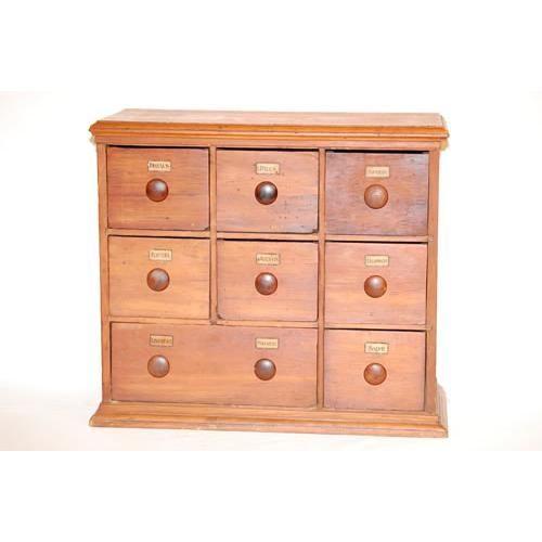 19TH CENT. NEW ENGLAND APOTHECARY CHEST-PINE DIMINUTIVE 8 DRAWER COUNTER TOP CHEST W/ 1 LONG & 7 SHORT DRAWERS, EACH W/ MEDICINAL LABEL, WOODEN KNOBS, MOLDED LID & BASE (19 3/4" T X 22 1/2" W X 11" D) - WEAR, IMPERFECTIONS