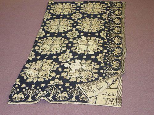 19TH CENT. NEW ENGLAND BLUE & WHITE COVERLET W/ FLORAL DESIGN W/ EAGLE & STAR BORDER SIGNED J. MILLER SOUTHPORT 1833 IN CORNER OF DECORATION (6'4" X 7'2") - REPAIRS, LOSSES, WEAR & IMPERFECTIONS