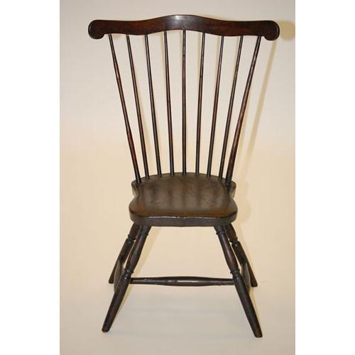 19TH CENT. NEW ENGLAND FAN BACK WINDSOR SIDE CHAIR W/ SHAPED CREST & SEAT, 9 SPINDLE BACK, SPLAYED LEGS & MEDIAL STRETCHER (36" T X 23 1/2" W X 19" D) - WEAR, IMPERFECTIONS