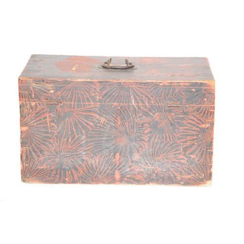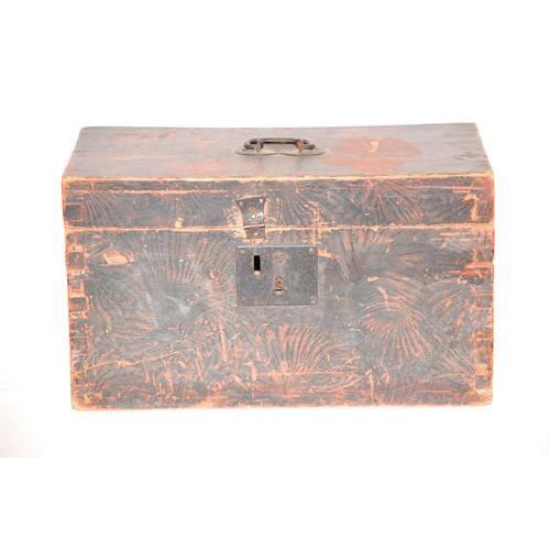 19TH CENT. NEW ENGLAND GRAIN PAINTED BOX-DOVETAILED PINE W/ BLACK OVER RED SPONGED GRAIN PAINTED DECORATION W/ IRON HANDLE & LOCK (9 1/4" T X 16" W X 8 3/4" D) - PAINT WEAR, MISSING LOCK HASP, IMPERFECTIONS