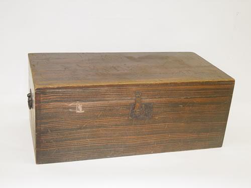 19TH CENT. NEW ENGLAND GRAIN PAINTED PINE DOVETAILED FLAT TOP TRUNK W/ IRON LOCK, ESCUTCHEON & HANDLES & RED & BLACK GRAIN PAINT (12" T X 30" W X 15" D) - WEAR & IMPERFECTIONS;
