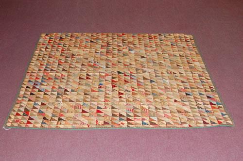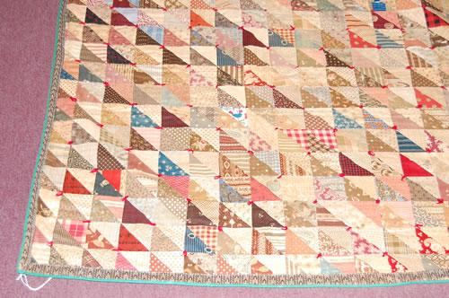 19TH CENT. NEW ENGLAND HAND SEWN QUILT - TRIANGLES OF PRINTED COTTON CALICO FABRICS W/ RED THREAD TIES & PRINTED BACKING (6 FT. 2" X 6 FT. 11") - WEAR, REPAIRS & LOSSES, IMPERFECTIONS