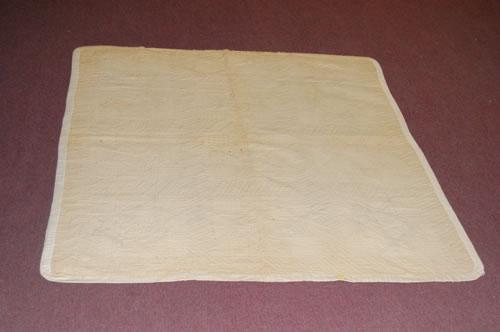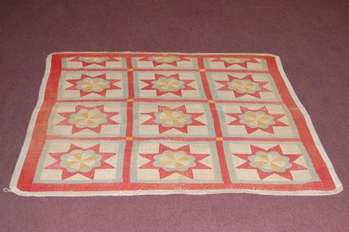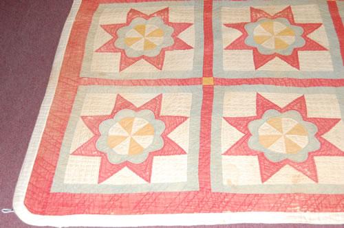 19TH CENT. NEW ENGLAND HAND SEWN QUILT W/ 9 SOLID & 3 HALF SQUARES W/ 8-POINTED STAR CENTERS EACH W/ LOBED INNER CIRCLES & PIE WEDGE MIDDLES (6 FT. 2 1/2" X 5 FT. 5") - WEAR, SOILING, LOSSES, IMPERFECTIONS