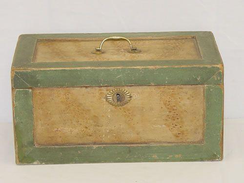 19TH CENT. NEW ENGLAND PAINT DECORATED BOX-GREEN TRIM W/ BIRDSEYE MAPLE SIMULATED PANELS, BRASS ESCUTCHEON & BAIL HANDLE - WEAR & IMPERFECTIONS