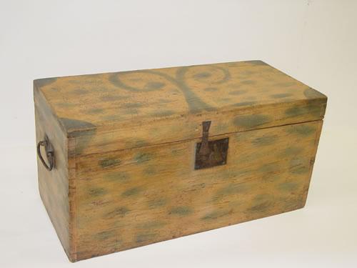 19TH CENT. NEW ENGLAND PAINT DECORATED PINE DOVETAILED FLAT TOP TRUNK W/ SALMON & GREEN PAINTED SWAG & SPOTS W/ PAINTED CORNERS & IRON LOCK, ESCUTCHEON & HANDLES (13 3/4" T X 27" W X 12 1/2" D) - PAINT WEAR & IMPERFECTIONS;