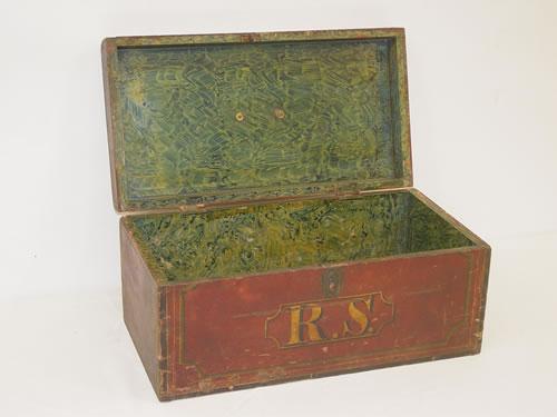 19TH CENT. NEW ENGLAND PAINT DECORATED PINE DOVETAILED DOCUMENT CHEST W/ RED PAINT & GOLD, GREEN & BLACK HIGHLIGHTS & INITIALS R.S., BLUE-GREEN SPONGE PAINTED INTERIOR, OVAL BRASS HANDLE & ESCUTCHEON (7 1/4" T X 15 3/4" W X 8 1/2" D)-PAINT WEAR, LOSSES