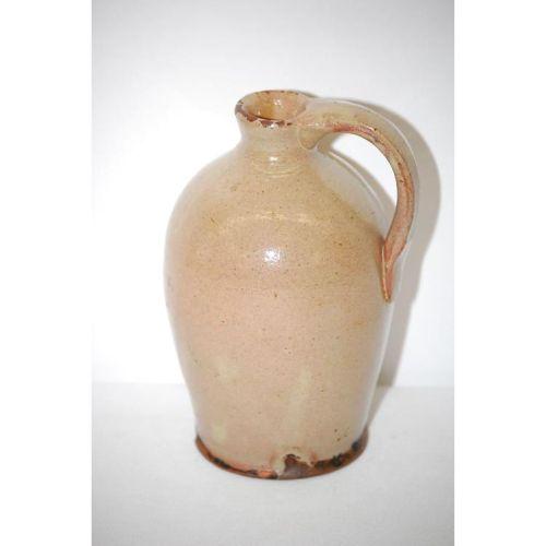 19TH CENT. NEW ENGLAND REDWARE JUG - SMALL SIZED W/ UNUSUAL CREAM COLORED GLAZE (PROBABLY MAINE)(6 1/2" T X 4 1/2" W) - WEAR, BASE EDGE & RIM CHIPS, IMPERFECTIONS