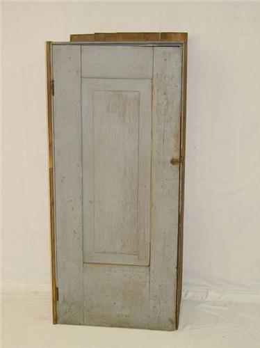19TH CENT. NEW ENGLAND SINGLE DOOR WALL CUPBOARD W/ RAISED PANEL DOOR IN OLD BLUE-GREY PAINT (BUILT-IN) - WEAR & IMPERFECTIONS;