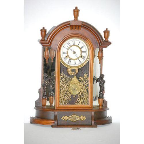 19TH CENT. NEW HAVEN CLOCK CO. WALNUT PARLOR MANTLE CLOCK W/ MIRRORED SIDES & CAST METAL CUPIDS (23" T X 16" W X 4" D) - WEAR, LOSSES & REPLACEMENTS, IMPERFECTIONS