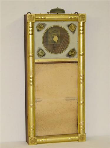 19TH CENT. NH GILT SPLIT COLUMN MIRROR CLOCK W/ REVERSE ON GLASS UPPER FACE PANEL (CRACKED) W/ FRUIT DECORATION, BRASS WORKS - NO MAKER, LOWER MIRROR MISSING, IMPERFECTIONS