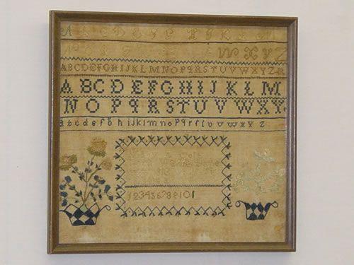 19TH CENT. NH NEEDLEWORK SAMPLER-MARY A. COLBY BORN WARNER JUNE 12TH 1818 - WROUGHT IN 14 YR OF HER AGE W/ 3 ROWS OF ALPHABET W/ CENTRAL PANEL W/ NAME & DATE & 2 LARGE POTTED PLANTS ON EITHER SIDE (10 3/4" X 11 3/4") - SOME TONING & MINOR LOSSES