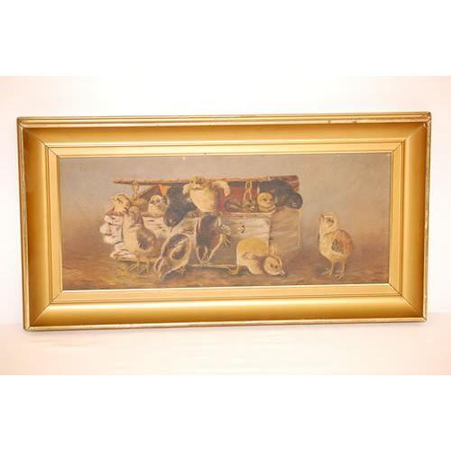 19TH CENT. OIL ON ARTIST BOARD OF CHICKS ESCAPING FROM A BIRCH BARK BOX-UNSIGNED IN A GILT WOODEN FRAME (6 3/4" X 16 3/4") - WEAR, IMPERFECTIONS