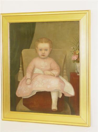 19TH CENT. OIL ON CANVAS PORTRAIT OF LITTLE GIRL IN AN EMBROIDERED PINK DRESS W/ FANCY FURNITURE & DRAPERIES-UNSIGNED IN A CUSTOM GILT FRAME (30" X 24 1/2") - RESTORED & RELINED, IMPERFECTIONS