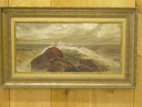 19TH CENT. OIL ON CANVAS SEASCAPE OF WAVES CRASHING ON ROCKS SIGNED ON BACK ELISHA BAKER '90 (12 3/4" X 26 1/2"-SIGHT) - SMALL PUNCTURE REPAIR, IMPERFECTIONS;
