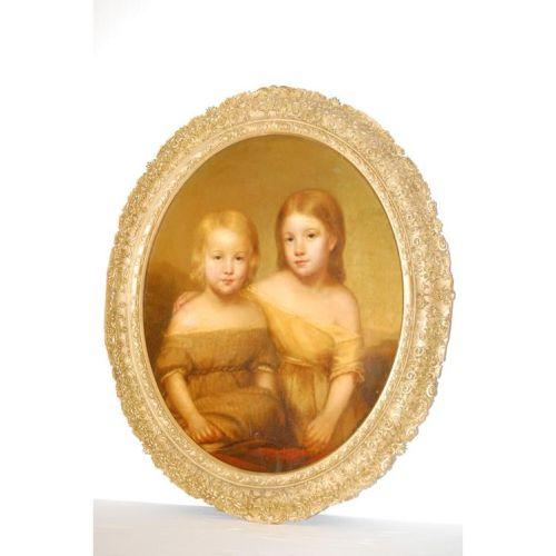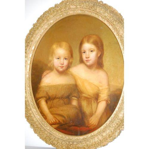 19TH CENT. OVAL OIL ON CANVAS PORTRAIT OF 2 BLONDE SIBLING CHILDREN EMBRACING-UNSIGNED IN A FANCY GILT CARVED PLASTER FRAME (POSSIBLY CONTINENTAL) (29 1/4" X 24 1/4") - WEAR, REPAIRS, CRAQUELURE, IMPERFECTIONS