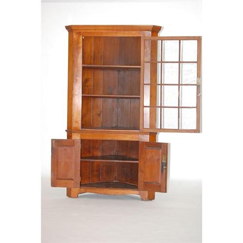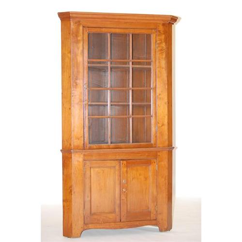 19TH CENT. PA WALNUT CORNER CUPBOARD - 1 PC. COUNTRY WALNUT CUPBOARD W/ 12 GLASS PANE DOOR MOLDED CABINET OVER A LOW CABINET W/ RAISED PANEL DOORS, BRACKET BASE & BRASS HARDWARE (81.5"T X 46"W X 26"D)-WEAR, REPAIRS, REPLACEMENTS, IMPERFECTIONS