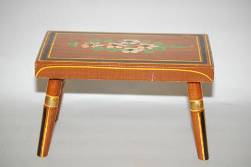 19TH CENT. PAINT DECORATED CRICKET STOOL - 12" STOOL W/ TURNED LEGS W/ POLYCHROME FLORAL DECORATION & BANDED LINE BORDER (7" T X 12" L X 7" W) - WEAR & IMPERFECTIONS