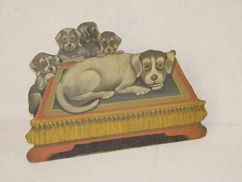 19TH CENT. PAINT DECORATED SHAPED PINE "DUMMY BOARD" W/ FOLK ART PAINTING OF DOG & 4 VERY CUTE PUPPIES ON A TASSLED PILLOW - WEAR & IMPERFECTIONS;