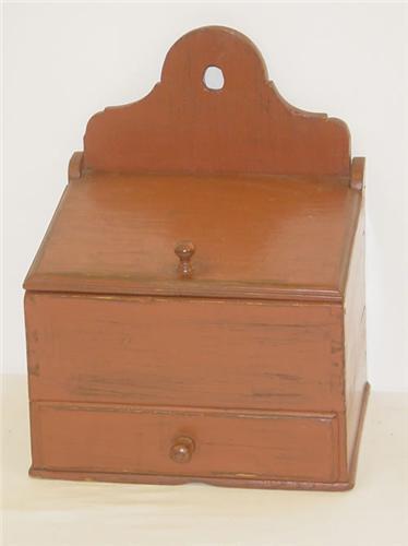 19TH CENT. PAINTED 1 DRAWER WALL BOX-PINE W/ MOLDED SLANT LID & DRAWER FRONT, SHAPED BACKBOARD W/ DOVETAIL CONSTRUCTION & WOODEN KNOBS IN SALMON PAINT (14" T X 11" W X 9" D) - WEAR, REPAIRS, IMPERFECTIONS