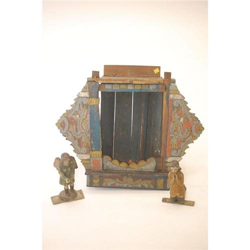 19TH CENT. PAINTED & CARVED FIGURES & SHRINE - POLYCHROME PAINTED WALL BOX SHRINE W/ LEAFY CARVINGS (20" X 24"), 8 1/2" ANGEL W/ TIN WINGS & 7 1/4" KNEELING SINNER (SPANISH COLONIAL STYLE RELIGIOUS CARVING) - WEAR, LOSSES, IMPERFECTIONS