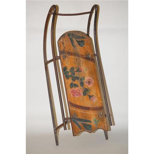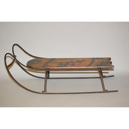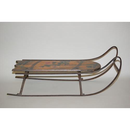 19TH CENT. PAINTED CHILDS SLED - 19TH CENT. WOODEN SLED W/ SHAPED BOARD W/ FLORAL DECORATIONS & LINE HIGHLIGHTS & WROUGHT IRON FRAME (11 1/2" T X 31" L X 13" W) - WEAR, PAINT LOSS, OXIDATION & IMPERFECTIONS