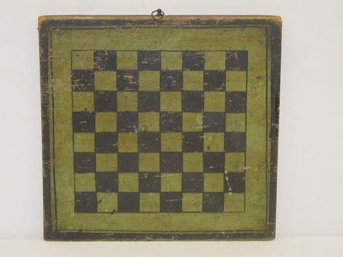 19TH CENT. PAINTED DOUBLE SIDED GAMEBOARD-OLD GREEN & BLACK (14" SQUARE) - PAINT WEAR & LOSSES