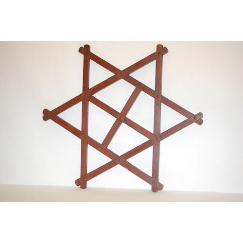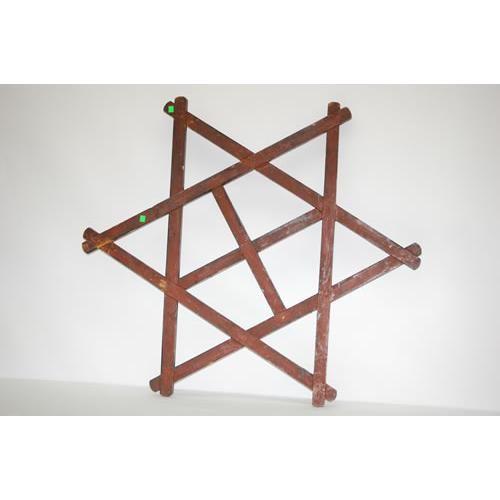 19TH CENT. PAINTED FOLK ART WOODEN WALL RACK-6 POINTED CRISSCROSS STAR IN RED PAINT W/ SQUARE CUT NAIL HOOKS (44 1/2" T X 39 1/4" W) - WEAR, REPAIRS, IMPERFECTIONS