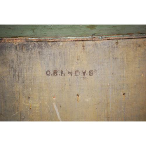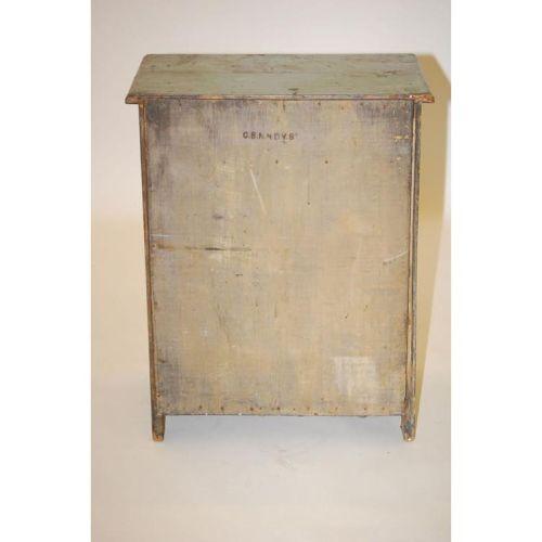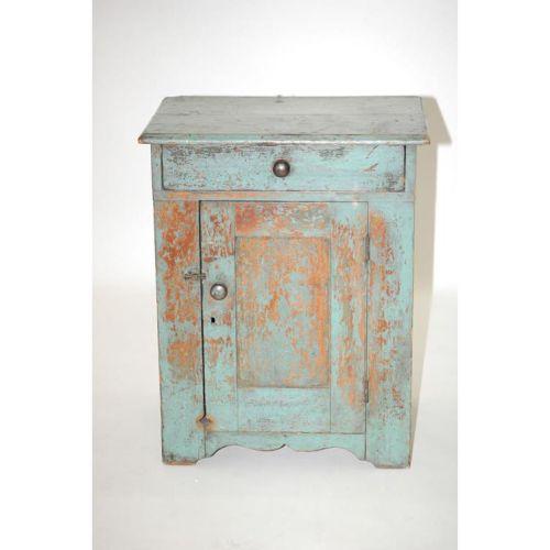 19TH CENT. PAINTED HALF COMMODE - PINE & WALNUT COMMODE IN OLD BLUE GREEN PAINT W/ SINGLE DRAWER OVER A RECESSED PANEL DOOR W/ SHAPED APRON & WOODEN KNOBS (30" T X 24" W X 16 1/2" D) - WEAR TO PAINT, LOSSES, IMPERFECTIONS