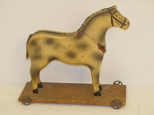 19TH CENT. PAINTED HORSE PULL TOY - DAPPLED PAINTED WOODEN PONY W/ PARTIAL LEATHER HARNESS ON PLAIN WOODEN PLATFORM & TIN WHEELS (11 1/2" T X 12" L X 4 3/4" D) - WEAR, LOSSES, IMPERFECTIONS