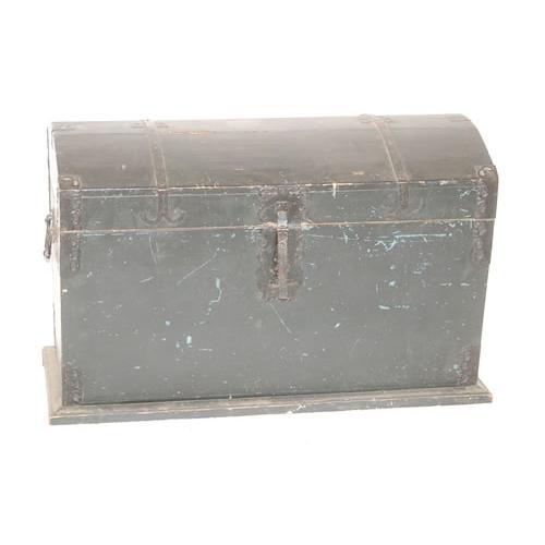19TH CENT. PAINTED IMMIGRANT'S TRUNK - HARD PINE DOVETAILED DOME TOP TRUNK W/ CANTED SIDES IN BLACK OVER OLD BLUE PAINT W/ FANCY WROUGHT IRON HARDWARE & BAIL HANDLES (CENTRAL EUROPEAN)(32" T X 49" W X 27" D) WEAR, SEAM CRACKS, SMALL LOSSES