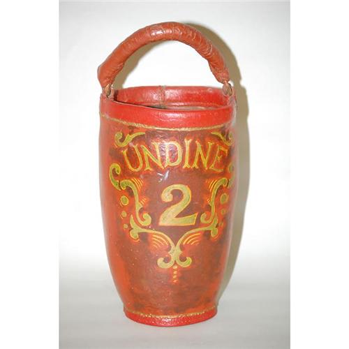 19TH CENT. PAINTED LEATHER FIRE BUCKET - 12 3/4" RED PAINTED LEATHER FIRE BUCKET "UNDINE #2" PAINTED IN GOLD W/ ORIGINAL LEATHER HANDLE (SECOND PAINT) - SM. HOLE IN BOTTOM, LOSSES, WEAR, IMPERFECTIONS